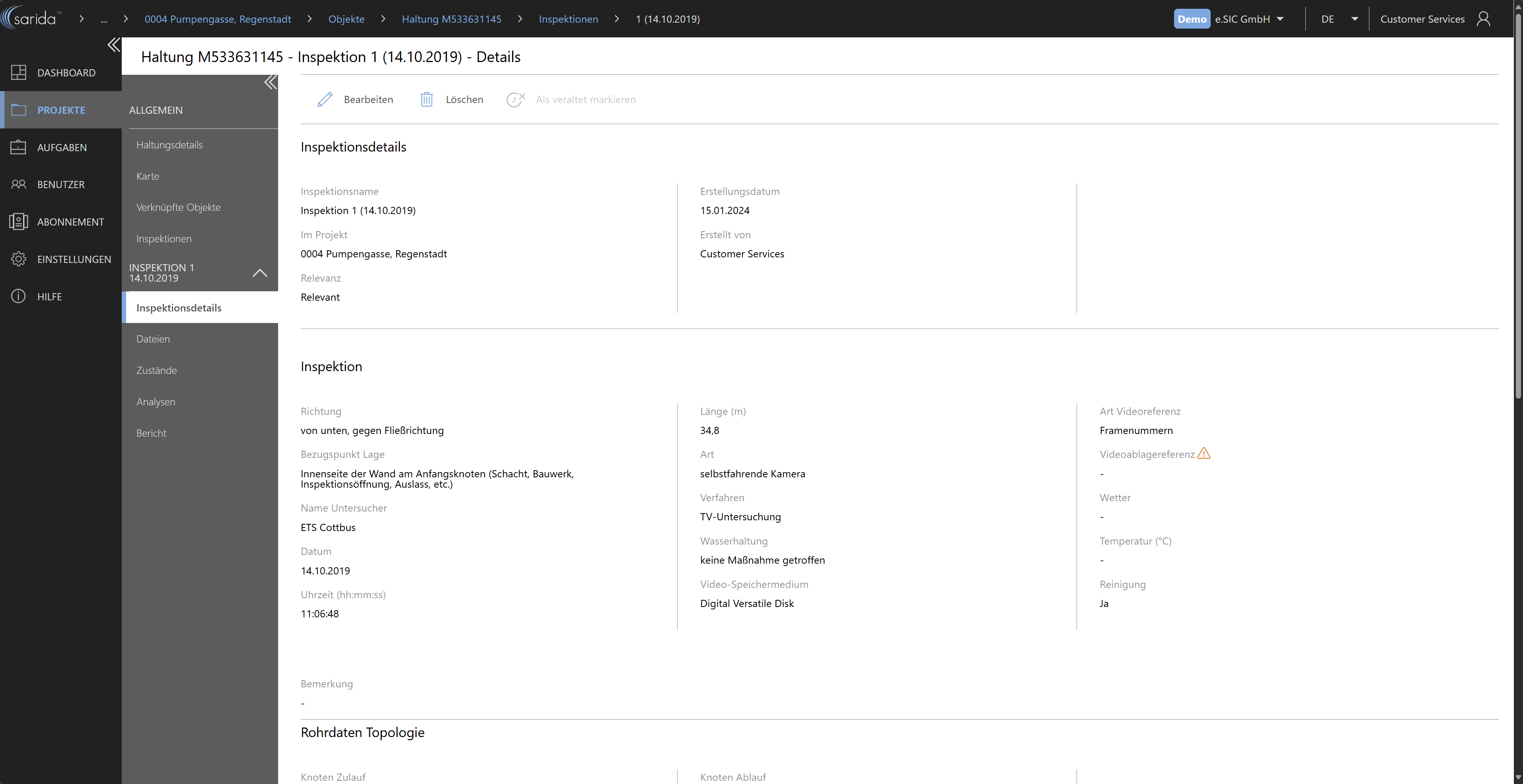 Bei den Inspektionen haben die Nutzer die Möglichkeit, die genauen Inspektionsdetails analog zu den Haltungen einzusehen, jedoch mit anderen Inhalten. Durch die KI-Analyse der Inspektionen werden verschiedene Dateien wie Screenshots, PDFs und Videos abgelegt. Diese Dateien resultieren aus den erfassten Zuständen der Analyse und sind neben dem eigentlichen Bericht als separate Screenshots geführt.
